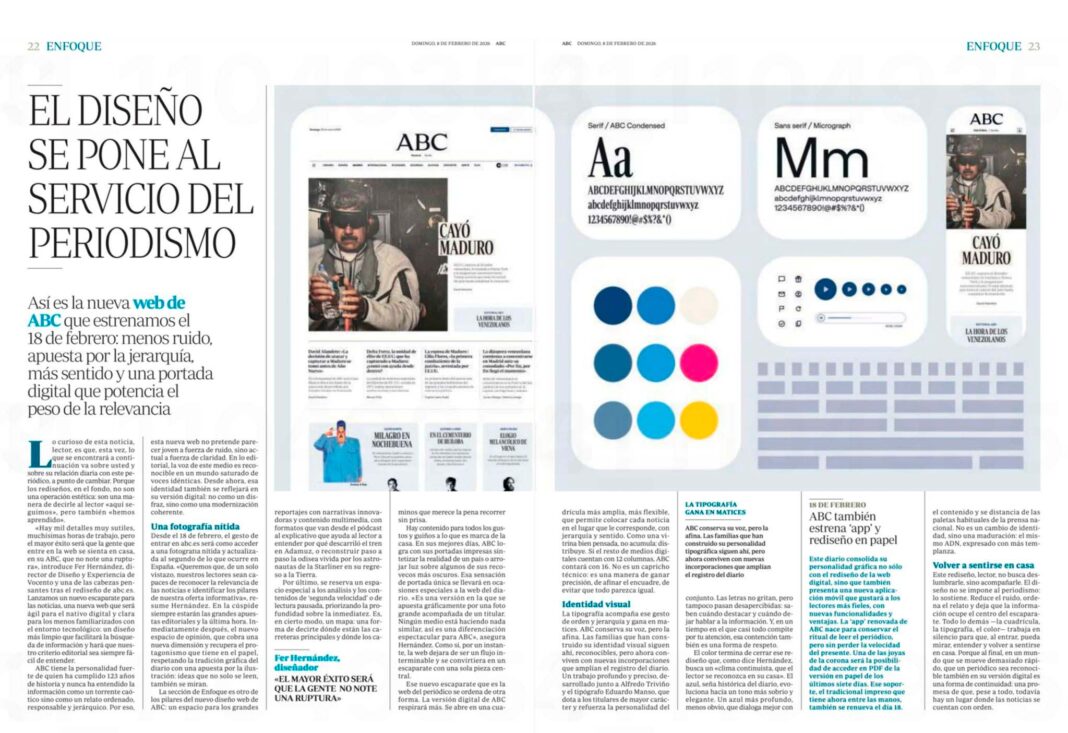 ABC renovará el próximo 18 de febrero su página web, su aplicación móvil y su edición en papel con un rediseño integral orientado a mejorar la experiencia de lectura y reforzar la claridad informativa, según explica el propio diario en una doble página publicada en su edición dominical, donde detalla los criterios editoriales y visuales que han guiado el proceso. El proyecto parte de una premisa explícita: reducir el ruido visual, ordenar mejor los contenidos y dar más peso a la relevancia informativa, tanto en digital como en papel, sin alterar la identidad histórica del periódico.