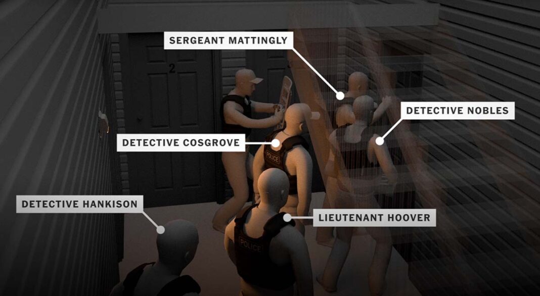 Cuando ninguno de los oficiales de policía que allanaron la casa de Breonna Taylor en Kentucky usó cámaras corporales, lo que impidió una comprensión completa de lo que sucedió, el equipo de Investigaciones Visuales construyó un modelo tridimensional de la escena y armó secuencias críticas de eventos para mostrar cómo la mala planificación y el trabajo policial de mala calidad condujo a un desenlace fatal.