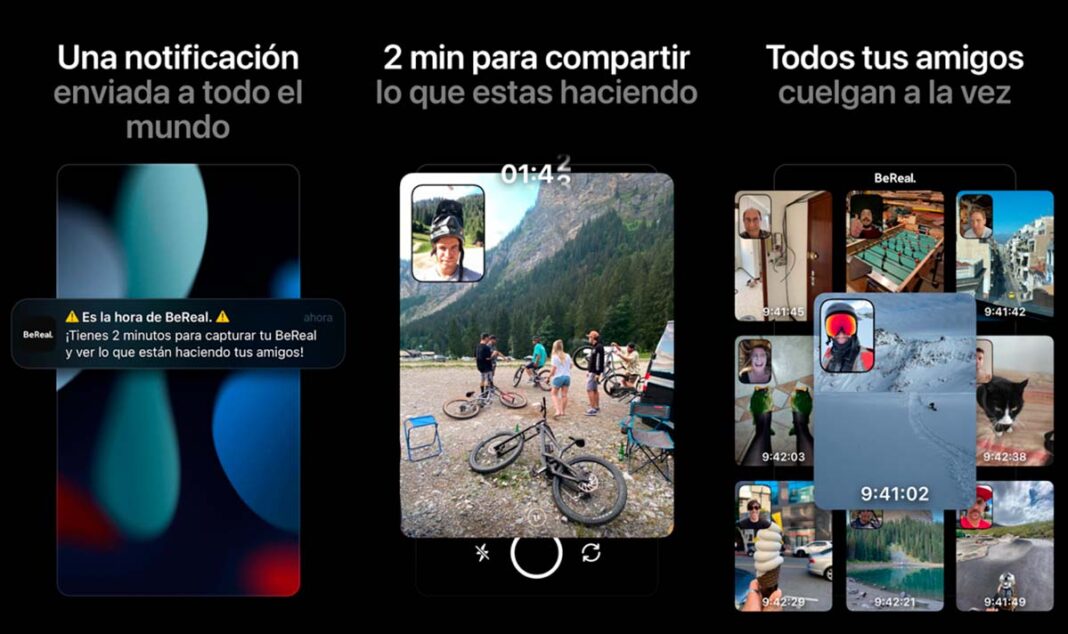 BeReal, mediante una notificación, invita a los usuarios a tomar una foto (con la cámara trasera y delantera de forma simultánea) en un momento aleatorio todos los días.