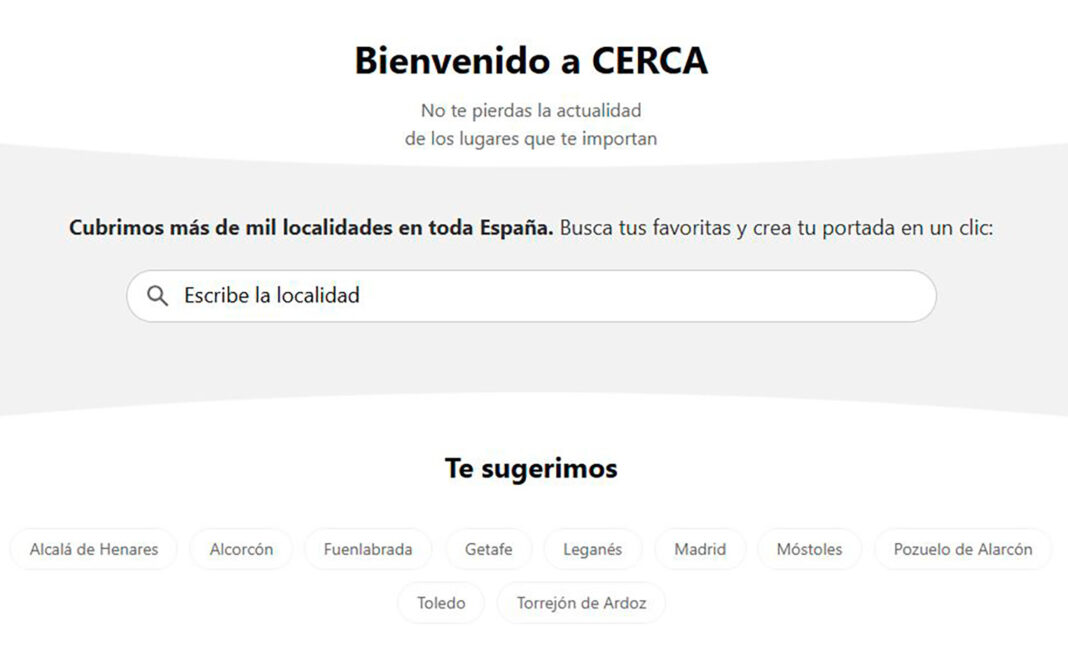 CERCA cuenta actualmente con más de 1.000 municipios disponibles y, según el grupo editorial, la oferta seguirá ampliándose progresivamente. El sistema permite fijar como favoritos distintos municipios en función de la vinculación personal o profesional del lector. Un usuario que resida en Alcalá de Henares, trabaje en Torrejón de Ardoz y tenga una segunda residencia en Peñíscola puede integrar esas tres localidades en su selección y generar un flujo informativo ajustado a esa combinación territorial.