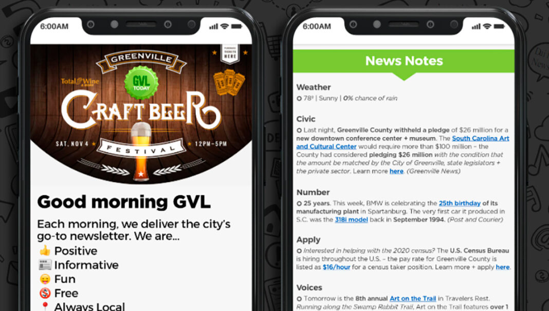 Otra de las claves del éxito, apunta Heafy, es una cuidadosa curación del contenido. Inusualmente para lo que es una publicación local, 6AM City evita intencionalmente temas como el crimen y la política. “Estamos diseñados para ser un motor de marketing para las ciudades”, explicó Heafy. “Seleccionamos lo mejor de lo que sucede allí para ayudar a los suscriptores a convertirse en mejores ciudadanos, más comprometidos e involucrados, ya sea que eso signifique decirle rápidamente cómo puede unirse a juntas, organizaciones sin fines de lucro, participar en eventos de caridad o dónde ir a tomar un cóctel. Es más de ese enfoque de estilo de vida”.