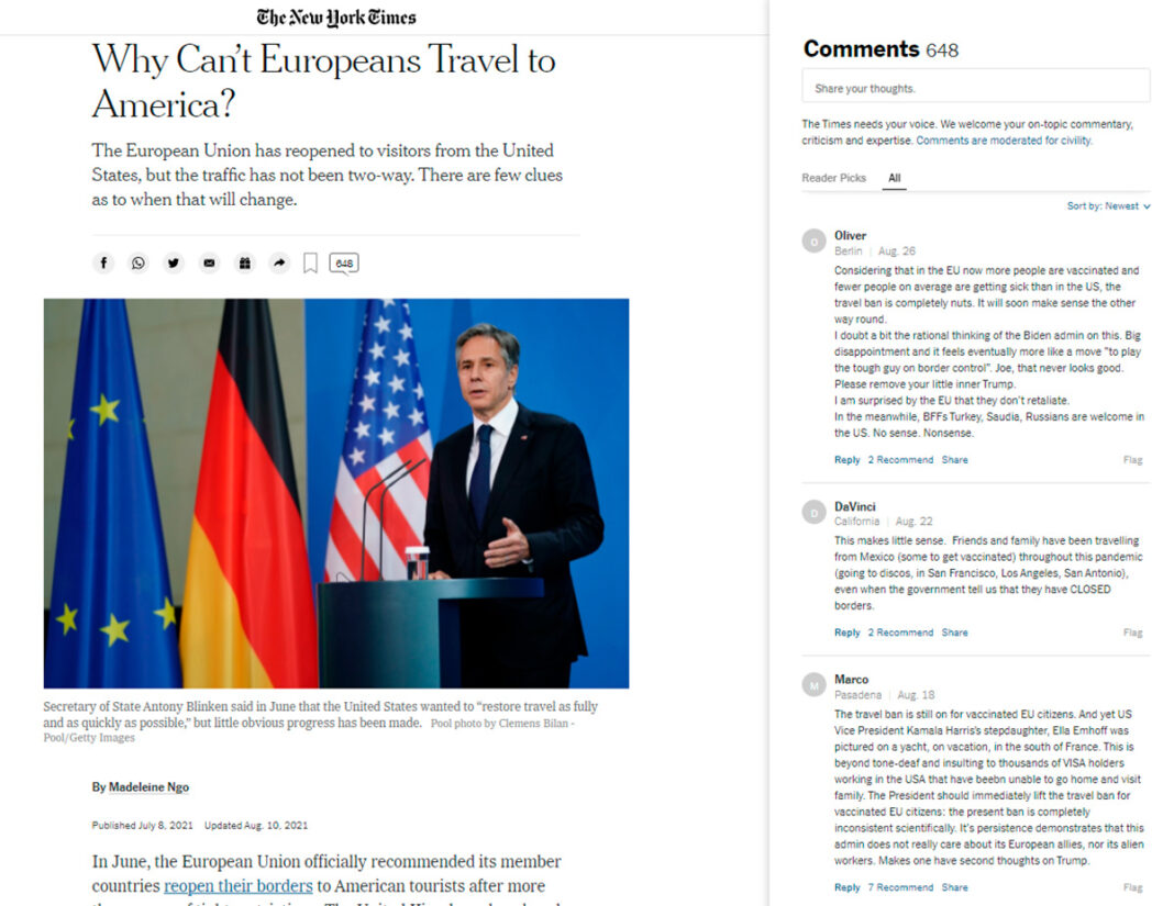 Además de que los comentarios de calidad ayudan a los lectores a comprender el mundo, también juegan un papel importante en la configuración de las noticias e informes y, por tanto, a hacer un mejor periodismo. En un artículo reciente sobre los cierres de fronteras de Estados Unidos con países europeos, decenas de comentaristas lamentaron la separación de sus seres queridos, sin saber cuándo se reunirían. Un comentarista, Kevin, de Alemania, escribió esto sobre su pareja: “Está vacunada. Estoy vacunado ¿Qué más podemos hacer? Quiero abrazarla por fin». Los comentarios en esta línea se multiplicaron.