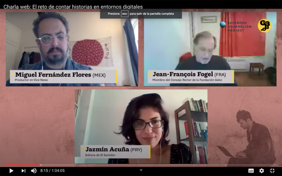 Para conocer de cerca cuáles son los recursos que usan en esas redacciones, Jazmín Acuña, cofundadora y editora de El Surtidor, y Miguel Fernández Flores, productor de campo sénior en VICE News, transparentaron sus claves en una charla web que organizó la Fundación Gabo a fines de octubre. En el encuentro también participó el periodista Jean-François Fogel, maestro y miembro del Consejo Rector de la Fundación, para conversar con ellos sobre “El reto de contar historias en entornos digitales”.