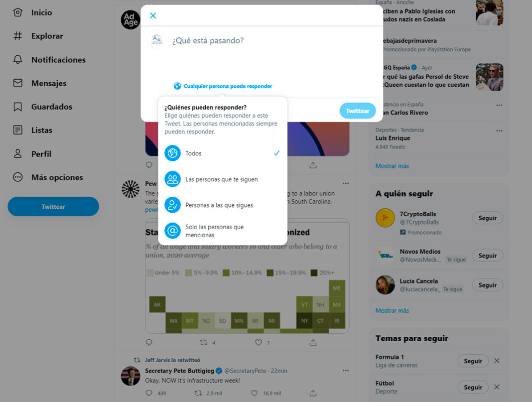 Entre las nuevas funcionalidades destacaba la posibilidad, antes de tuitear, de poder elegir quién puede responder, con tres opciones: todos (Twitter estándar y la configuración predeterminada); sólo las personas a las que sigues, o sólo las personas que mencionas.