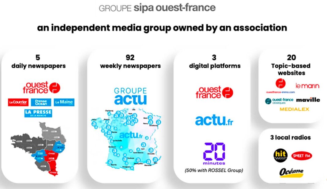 El grupo SIPA Ouest-France, con sede en Rennes y propietario del diario Ouest-France, el más leído en lengua francesa, cuenta con 4.200 empleados, incluidos 1.200 periodistas y cerca de 4.000 corresponsales locales. Además de sus cabeceras impresas y digitales, el grupo opera radios, revistas y múltiples portales informativos, entre ellos Actu.fr y 20 Minutes (este último en alianza con el grupo belga Rocel).