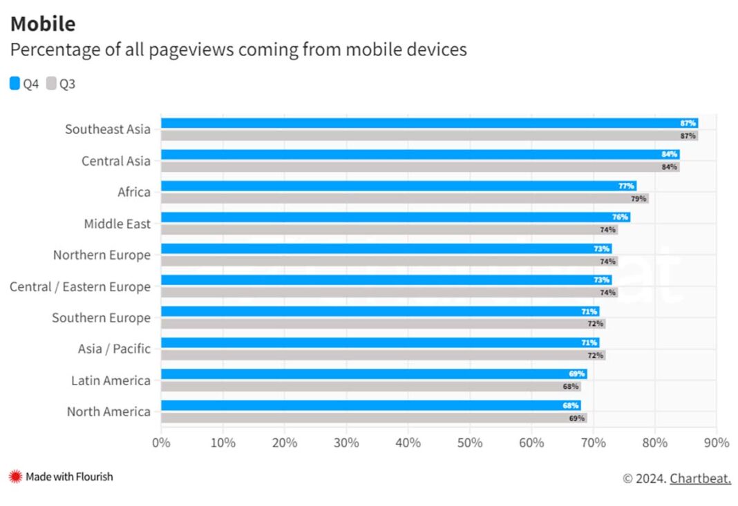 El Sudeste Asiático destacó con un 87% de visualizaciones de páginas a través de dispositivos móviles en el cuarto trimestre. Asia Central y África le siguieron con un 84% y 77% respectivamente. Ninguna región registró menos del 68% de sus visualizaciones de páginas desde dispositivos móviles.