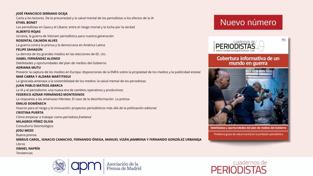 La Asociación de la Prensa de Madrid (APM) ha publicado el número 49 de Cuadernos de Periodistas, su revista de análisis sobre el ejercicio de la profesión periodística. Esta edición aborda temas clave como la cobertura informativa en zonas de conflicto, los retos del plan de medios del Gobierno y el impacto de la inteligencia artificial en la industria, además de poner el foco en la salud mental de los profesionales.