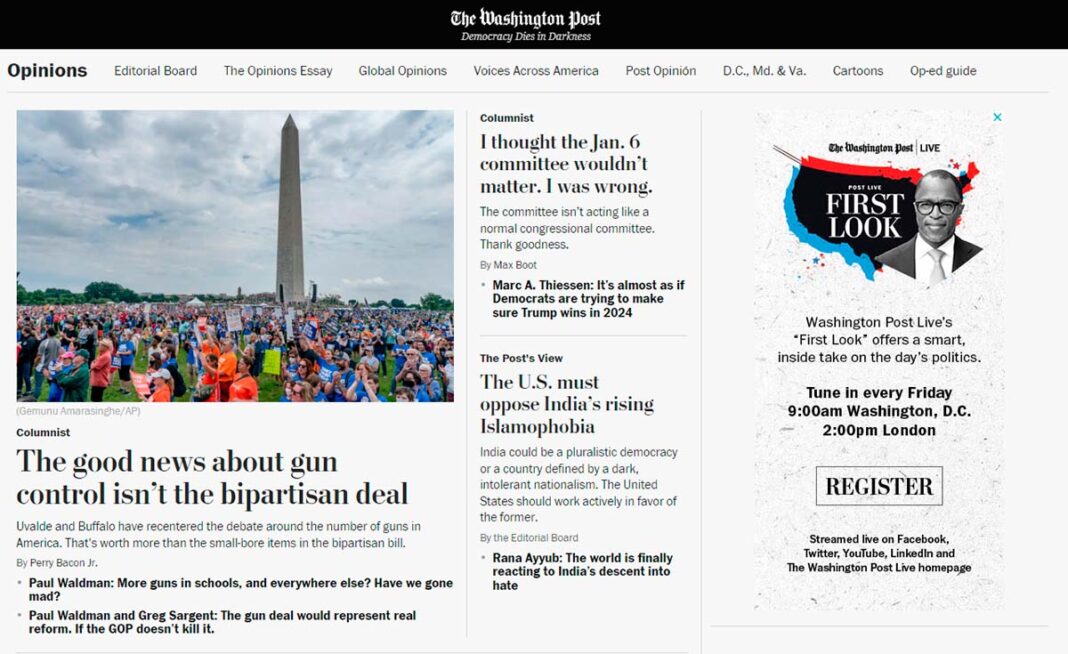 La página de opinión debería contar con una explicación del propósito de la sección. ¿Por qué hay una sección de opinión? ¿Cuál es la misión? También debería haber explicaciones de cómo se seleccionan los artículos de opinión externos. Por ejemplo, textos que aclararan cuestiones como estas: