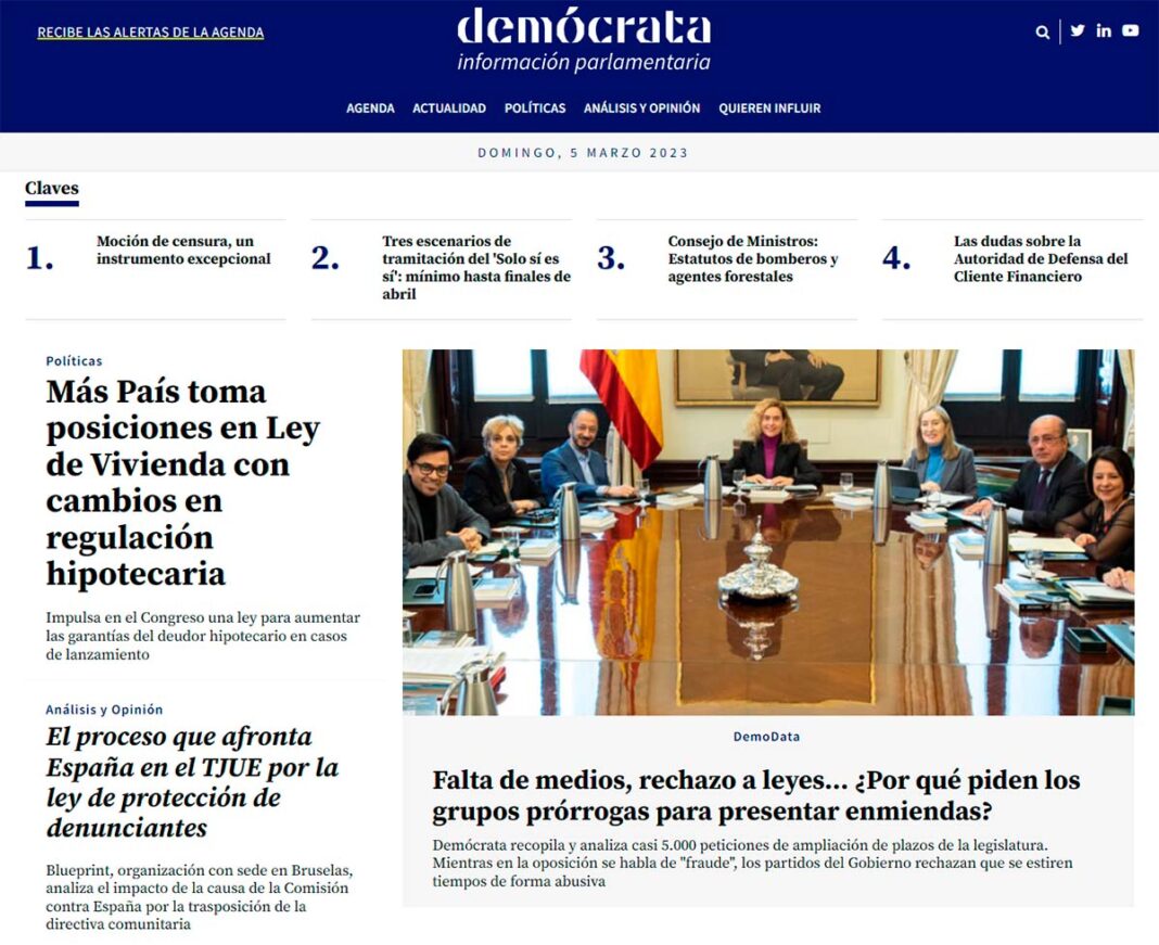 Un nuevo medio de comunicación online español pondrá el foco en la información parlamentaria. Hace unos días nacía Demócrata, medio entre cuyos objetivos está «promover el derecho del lector a recibir información veraz y el derecho de la ciudadanía en el marco de la iniciativa legislativa de los poderes ejecutivo y legislativo».