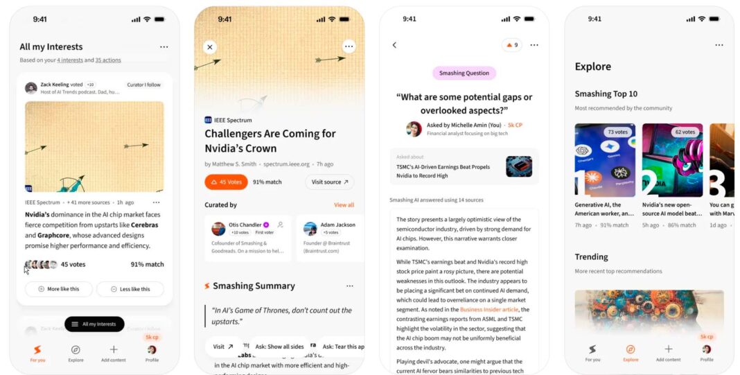La app también permite crear feeds de interés adaptados a temas como política, inversiones, salud y bienestar, o áreas más específicas, como empresas, criptomonedas o cambio climático. Con un sistema de algoritmos de inteligencia artificial, Smashing selecciona contenido en función de las preferencias del usuario, su historial de lectura y la popularidad dentro de la comunidad, optimizando así la relevancia de cada artículo o publicación.