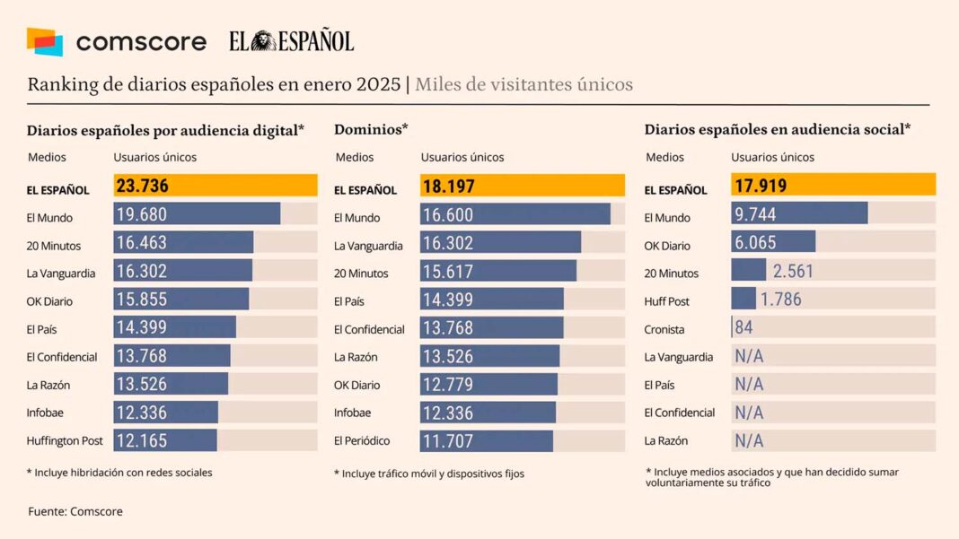 El Español registró en enero 23,73 millones de visitantes únicos en Comscore tras la incorporación del tráfico social a la medición, según los datos publicados por el medidor de audiencia, que cita el propio El Español. Esta cifra sitúa al diario por delante de El Mundo, que alcanzó 19,68 millones de usuarios, y de 20 Minutos, con 16,46 millones.