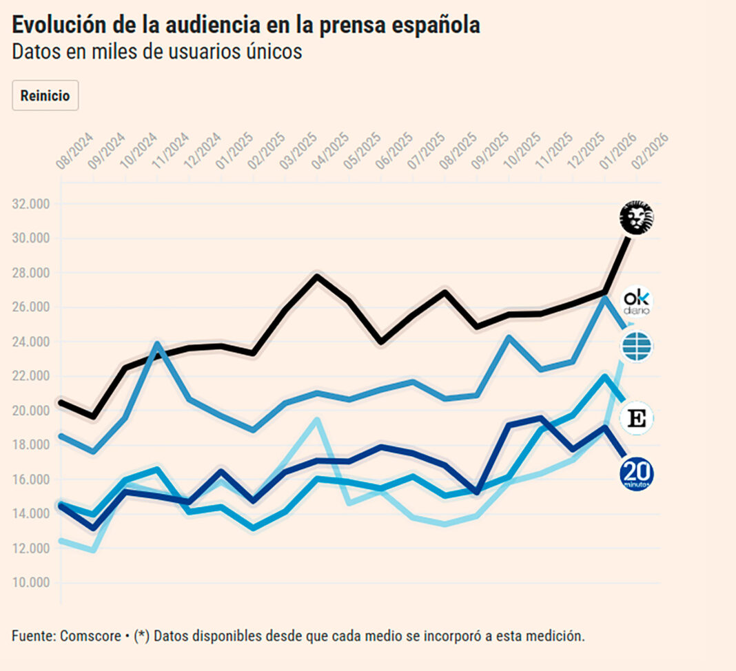 El sistema de medición de audiencias digitales que integra el consumo a través de web, aplicaciones móviles y redes sociales sitúa a El Español como el medio con mayor alcance en España durante febrero de 2026, con 31,19 millones de usuarios únicos, una cifra que refleja el impacto de la incorporación del tráfico social en los datos de audiencia, según un comunicado ofrecido por el propio medio.