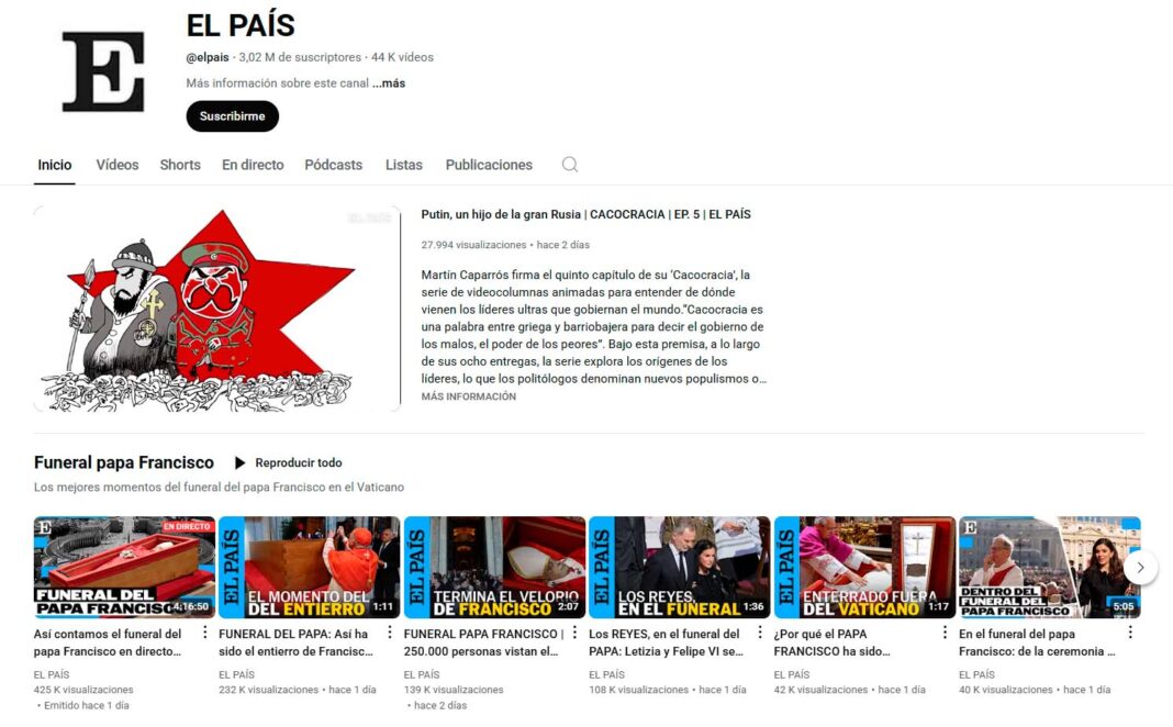 El periódico El País ha superado los tres millones de suscriptores en su canal de YouTube. Según los datos del propio diario, esta cifra lo sitúa por delante de La Vanguardia, con 2,15 millones de suscriptores, El Mundo, con 1,43 millones, La Razón, que suma 106.000, y Abc, con 95.000. A nivel europeo, El País se coloca tras The Guardian, que lidera con 3,86 millones de suscriptores, y supera a cabeceras como Der Spiegel (2,1 millones) y Le Monde (2,01 millones).