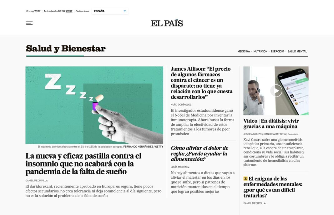 El País ha lanzado Salud y Bienestar. La nueva sección tiene como propósito «ayudar al lector a llevar una vida más saludable según la evidencia científica disponible». La nueva sección, estrenada este miércoles, hablará de salud, medicina, bienestar físico y emocional, y ofrecerá contenidos accesibles sobre nutrición, deporte, psicología y mente para prevenir enfermedades, así como los últimos avances científicos en medicina, según explican desde El País.