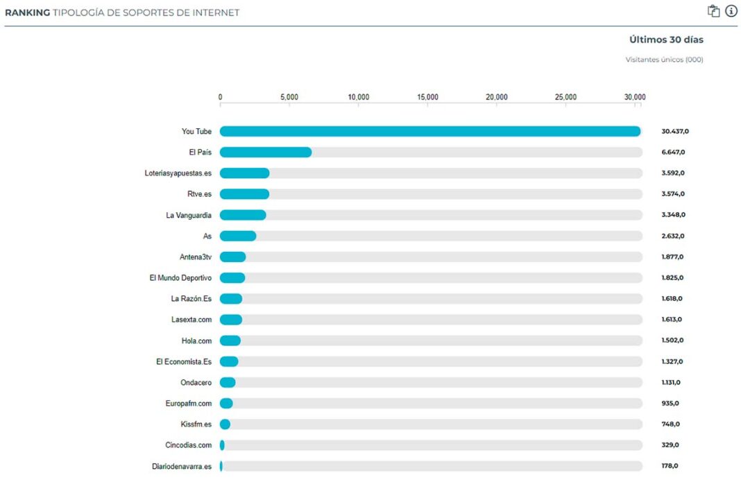 Los resultados de la última oleada del Estudio General de Medios (EGM) destacan a El País como el periódico digital más visitado de España, con un total de 6.647.000 usuarios, posicionándose como el segundo sitio web más frecuentado, solo superado por YouTube, que alcanza los 30.437.000 visitantes.