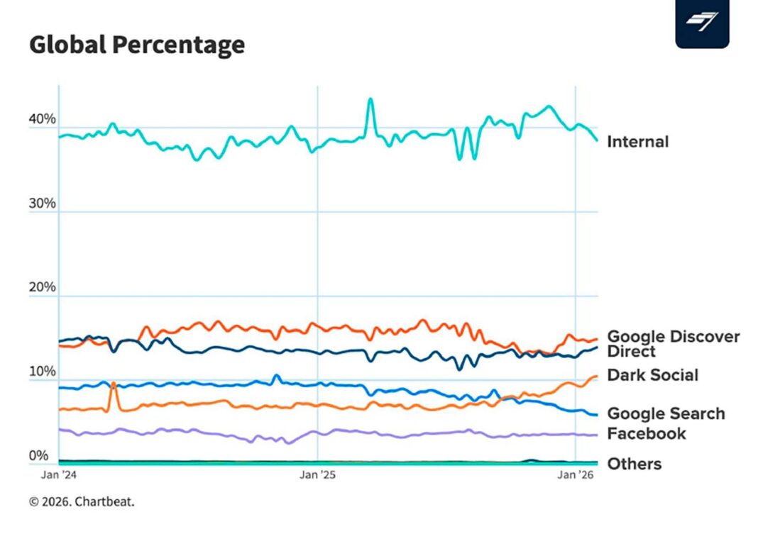El ecosistema digital de los medios está experimentando una redistribución de sus fuentes de tráfico sin que se produzca un desplome generalizado de la audiencia, según recoge el informe elaborado por Chartbeat del primer trimestre de 2026, que analiza miles de millones de páginas vistas mensuales y muestra cómo el descenso de los buscadores convive con el crecimiento de otras vías de acceso como el tráfico interno y los canales privados de recomendación.