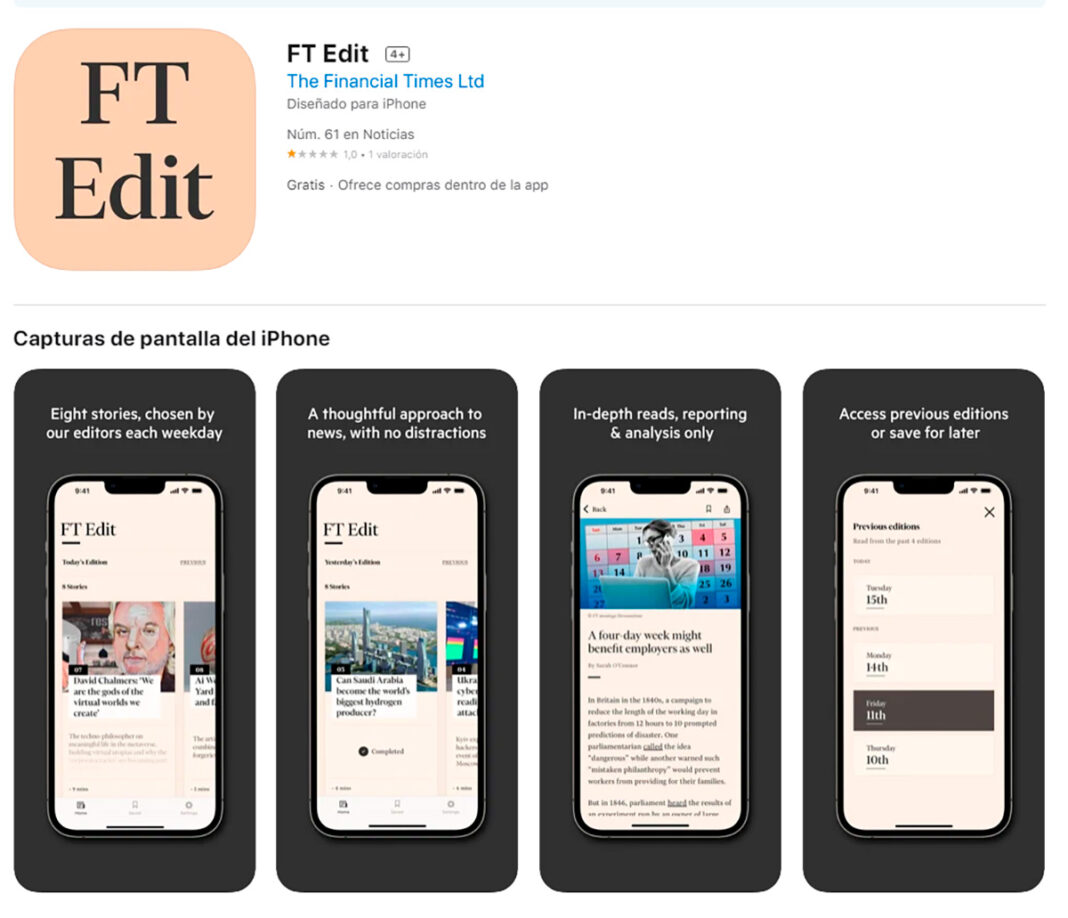 FT Edit, que funciona como aplicación (de momento sólo para iPhone), brinda a los lectores acceso a 8 artículos que selecciona el propio Financial Times, todos los días de la semana. La aplicación ofrece a los lectores «una selección curada de artículos de inmersión profunda en respuesta a un paisaje noticioso cada vez más concurrido y las distracciones que causan la proliferación de plataformas, canales y formatos digitales», explican desde FT. Los artículos seleccionados incluirán también noticias de los especiales del fin de semana.