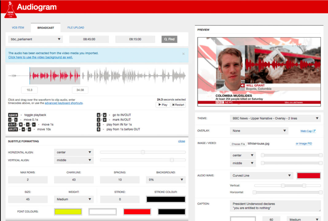Para combatir este problema, la emisora de servicio público WNYC de Nueva York ya creó hace unos años el generador de audiogramas y lo lanzó como una herramienta de código abierto. Permite a los periodistas seleccionar fragmentos de sonido de un archivo de audio y exportarlos como archivos de video MP4, que luego se pueden compartir en Facebook y Twitter.