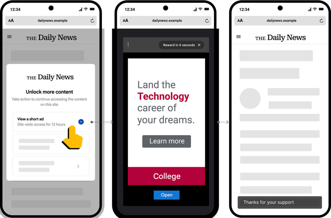 Entre las opciones incluidas figura ver un anuncio breve para desbloquear contenido, opción que incluye reparto de ingresos según el sistema habitual de Ad Manager. También se contempla que el lector seleccione temas de interés para personalizar la publicidad.