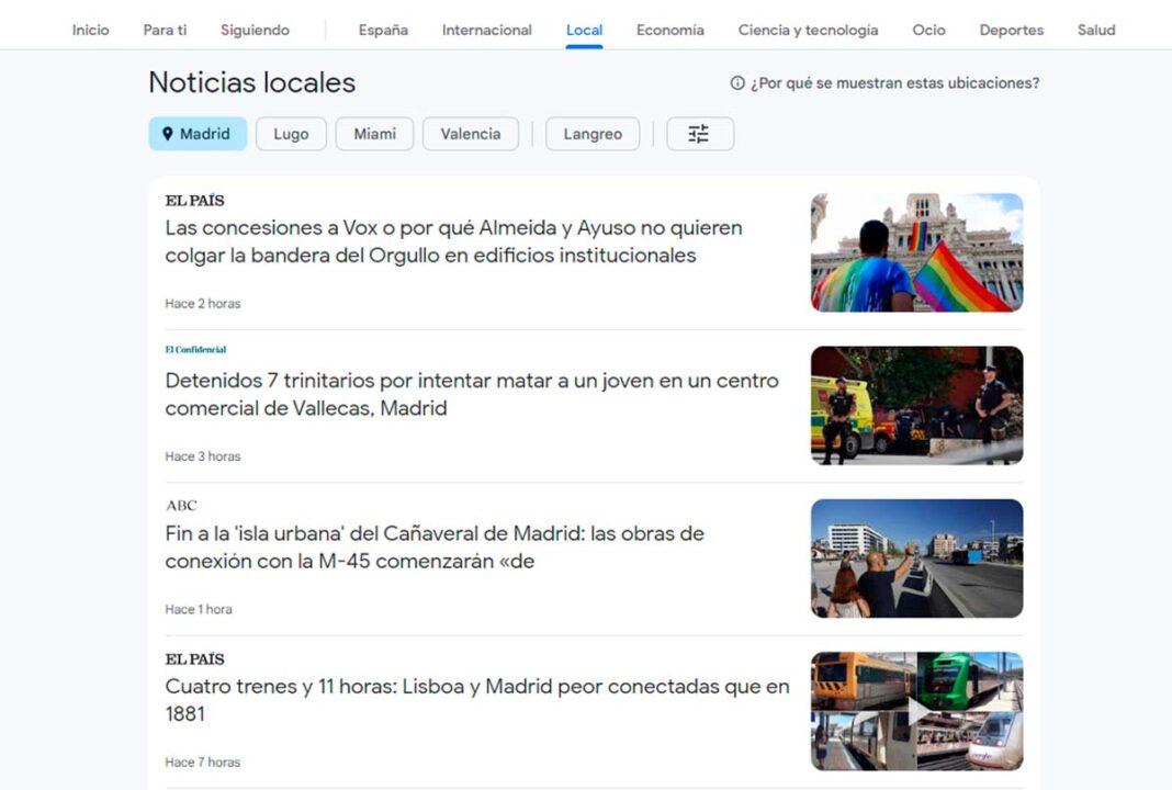 Ayer, cuando se reabrió Google News, apareció en un lugar destacado una pestaña que también se ha activado días atrás en otros países, como Reino Unido, y que antes estaba más escondida. Una pestaña a la derecha del cuerpo principal en la que, bajo la etiqueta de Noticias Locales, se ofrecen informaciones de la ciudad en la que está una persona si tiene activada la geolocalización, así como aquellas ciudades que previamente se hayan seleccionado. Hasta ahora, las noticias locales aparecían en un espacio al final de la página, muy poco visible.