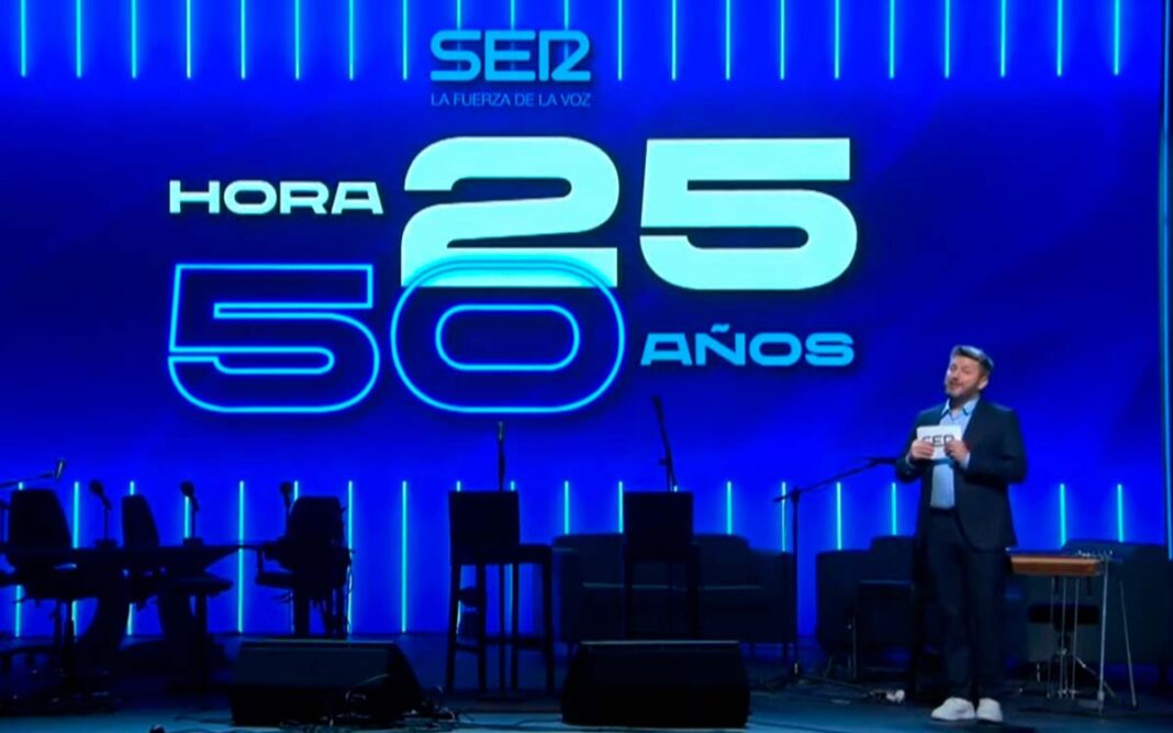 Hora 25 celebró anoche su medio siglo de historia en el Teatro Coliseum de Madrid con un programa especial dirigido por Aimar Bretos. El espacio de la Cadena SER repasó su larga trayectoria junto a algunos de los periodistas, exdirectores, colaboradores y demás protagonistas que lo han convertido a lo largo de los años en un referente informativo en España. Actualmente, Hora 25 es líder en la noche de la radio con más de 900.000 oyentes, según el último Estudio General de Medios (EGM).