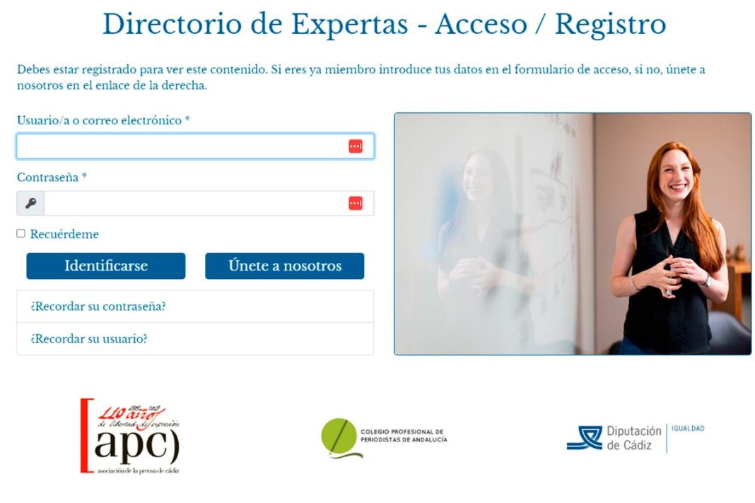 La Asociación de la Prensa de Cádiz, en colaboración con el Colegio Profesional de Periodistas de Andalucía, ha lanzado el Directorio de Expertas, con el objetivo de crear un directorio de mujeres expertas en todas las áreas profesionales, que pueda ser consultado por los/as profesionales del periodismo en su labor diaria, y promover la visibilización de las expertas participantes como fuentes de información cotidiana y fiable, «impulsando que se citen sus opiniones y criterios profesionales en las informaciones publicadas, en condiciones de igualdad con sus compañeros varones», explican desde la asociación.