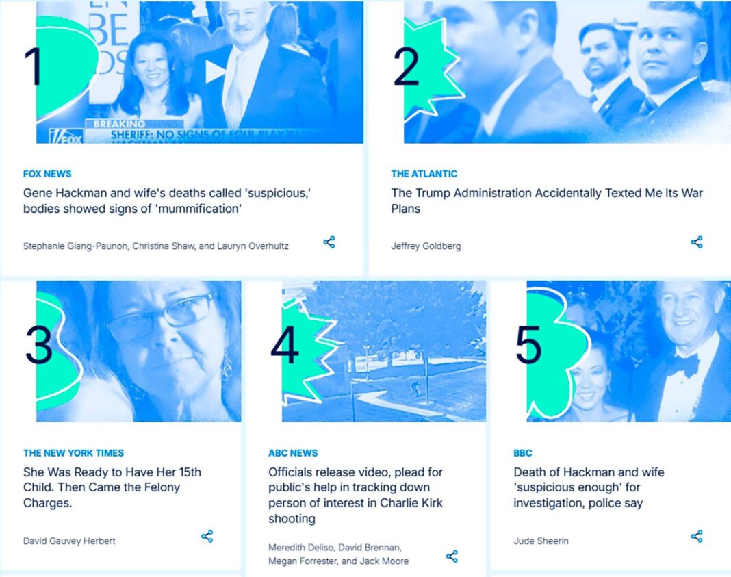 Más allá de los obituarios, el listado de las historias con mayor engagement revela una segunda constante: la combinación de poder político, conflicto y acceso a información sensible. Artículos como The Trump Administration Accidentally Texted Me Its War Plans, publicado por The Atlantic, o las investigaciones de The New York Times sobre las relaciones de Donald Trump con Jeffrey Epstein, figuran entre los contenidos con mayor tiempo de lectura, lo que apunta a una fuerte atracción por relatos que ofrecen una mirada interna a estructuras de poder, ya sea a través de filtraciones, documentos judiciales o reconstrucciones detalladas de hechos opacos.