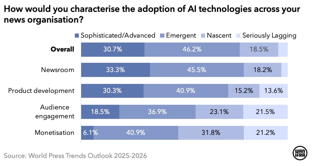 Pese a ese interés generalizado, el nivel de adopción es desigual. Solo el 30,7% de los medios considera que su uso de la IA se encuentra en un estadio avanzado o sofisticado, mientras que el 46,2% reconoce encontrarse todavía en una fase incipiente. Las redacciones concentran los mayores avances, con aplicaciones vinculadas a la producción y organización de contenidos, mientras que el uso de la IA en ámbitos como la monetización o la relación con las audiencias presenta un margen de desarrollo considerable.