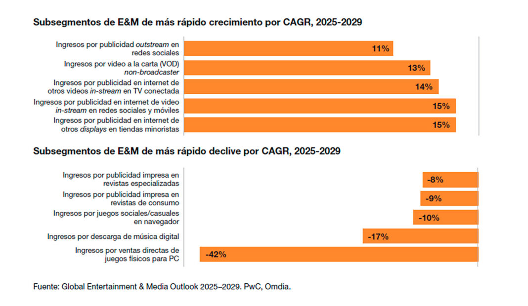 A nivel global, la industria del entretenimiento y los medios alcanzó 2,9 billones de dólares en 2024 y llegará a 3,5 billones en 2029, con un crecimiento anual medio del 3,7%, por encima del avance previsto de la economía mundial .