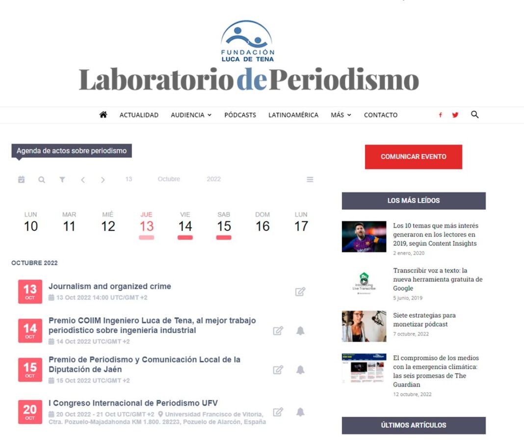A la agenda puede accederse desde la propia portada de Laboratorio de Periodismo o desde la página de la agenda Agenda de actos sobre periodismo.