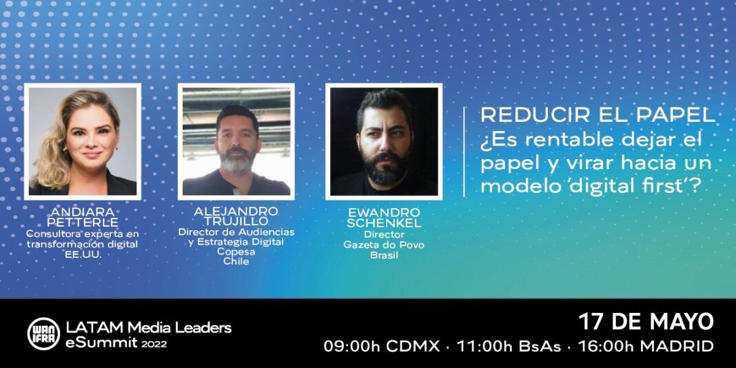El eSummit empieza este martes a las 9 horas de México DF, las 16 horas en la península ibérica, con la sesión Reducir el papel: aprendizajes de dos pioneros que apostaron de lleno por el digital. Participan Alejandro Trujillo Bustos, director de Audiencias y Estrategia Digital de Copesa, Chile; Ewandro Schenkel, director de Gazeta do Povo, Brasil; y Andiara Petterle, consultora experta en transformación digital, EE. UU.