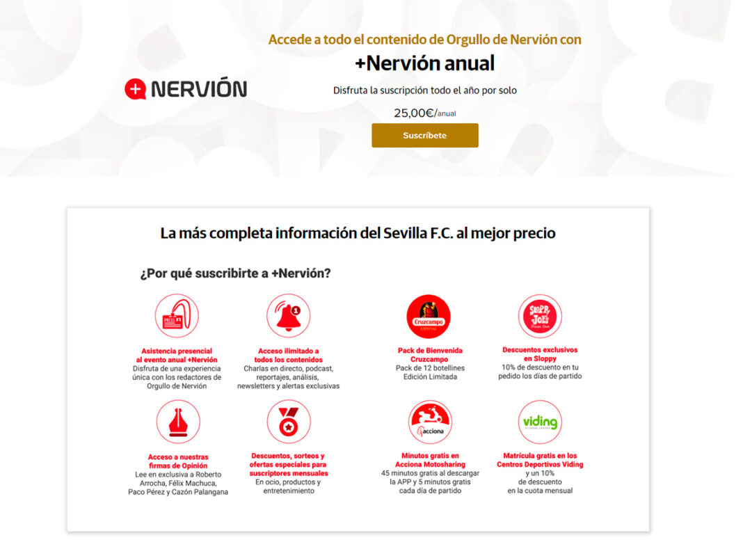 Por 25 euros al año (la suscripción a todo el periódico cuesta 99,99 euros anuales, aunque ahora hay una oferta de 59,99 euros el primer año), los suscriptores de +Nervión y + Palmera de tienen acceso a todos los contenidos, incluyendo no sólo artículos, sino charlas en directo, newsletter y podcast. En estos momentos hay una oferta de suscripción de tres meses por un euro.