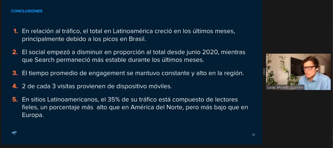 Moretti ha apuntado que «lo anormal no es que ahora haya caído el tráfico desde redes sociales, sino el pico que hubo en la pandemia». Mientras que en otros países caía el consumo desde redes y crecía en medios de comunicación, en Latinoamérica creció el tráfico desde redes, «quizá por la forma que de consumir noticias que tenemos. Empezamos a producir muchos más contenidos humanos y emotivos, y son los contenidos que funcionan mejor en las redes sociales. En los picos de la covid hubo muchas historias de médicos, sanitarios, personas queridas que perdimos, y esto típicamente funciona muy bien en redes sociales. En julio y agosto se observó cierto cansancio en la gente, los contenidos emotivos ya no eran tan numerosos, y la curva empezó a descender».