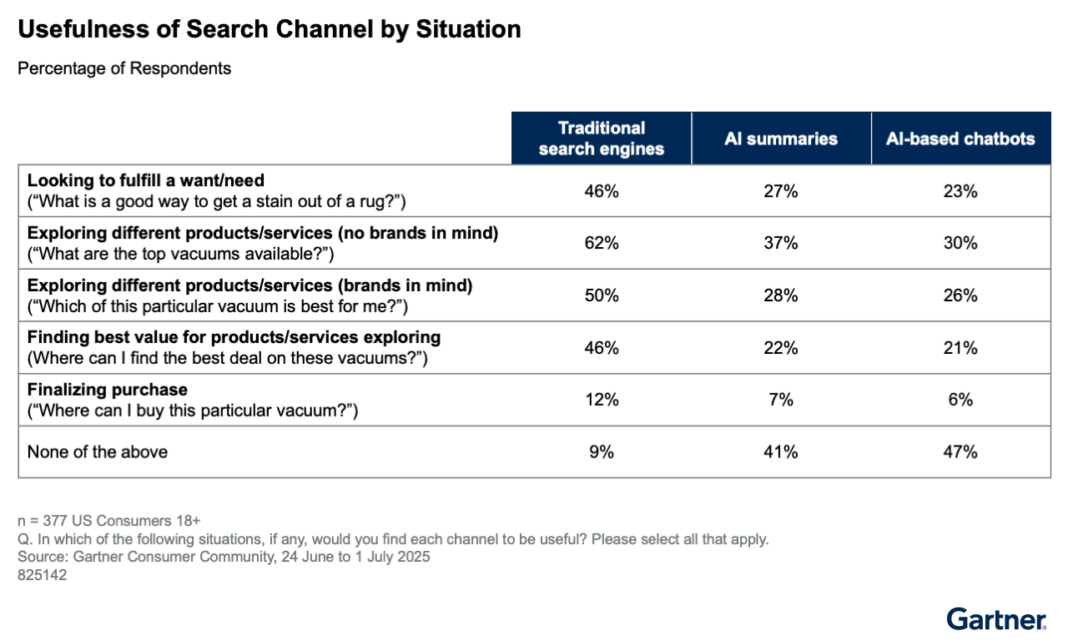 Un informe de la consultora Gartner muestra que el 53% de los consumidores no confía en la fiabilidad ni en la imparcialidad de los AI overviews, es decir, los resúmenes generados por inteligencia artificial en los procesos de búsqueda.