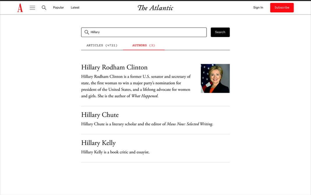 The Atlantic se encontró en esta encrucijada y se propuso desarrollar una solución innovadora. Analizaron sus datos y notaron incluso que muchas de las búsquedas principales en su sitio eran nombres de sus autores. Sin embargo, no había una forma sencilla para que los lectores encontraran todos los artículos de un escritor específico. Los perfiles de los autores estaban disponibles, pero solo se podían acceder desde una página de artículo, pinchando sobre su nombre, lo que resultaba en una experiencia de usuario poco óptima.