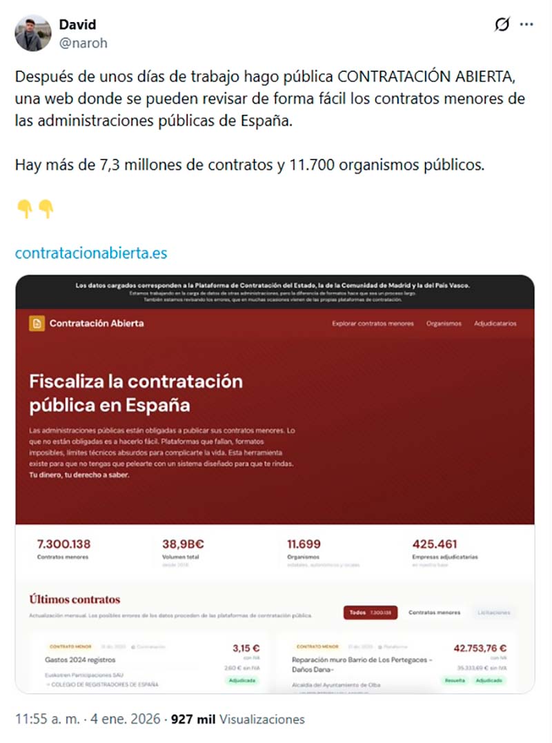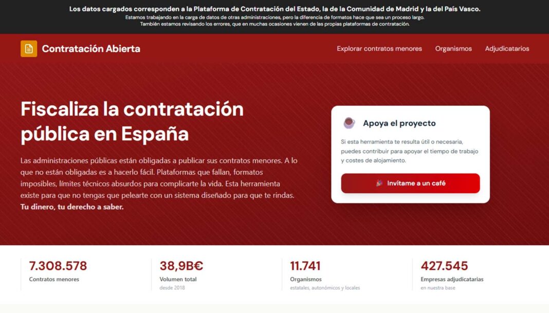 Una nueva plataforma digital bautizada como Contratación Abierta permite consultar y filtrar de forma más accesible la información sobre contratos menores públicos en España, un ámbito tradicionalmente disperso y de difícil acceso.