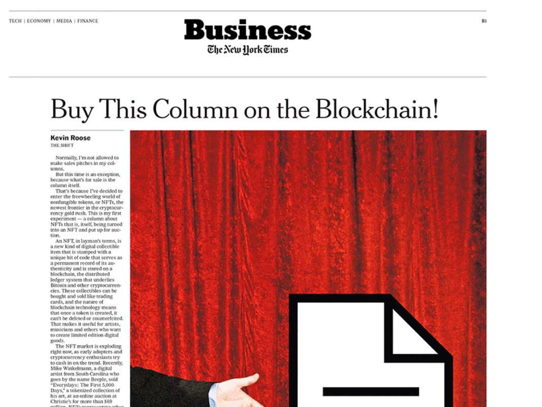 En marzo pasado, el NFT de la imagen de una columna del New York Times se vendió por más de 500.000 dólares, que se destinaron también a beneficencia. «¿Por qué alguien pagaría el precio de un Lamborghini de lujo por una imagen de mi texto? -se preguntaba el autor del artículo. Después de todo -agregaba-, el NFT solo era una firma criptográfica vinculada a la imagen de una columna que cualquiera podría leer en el sitio web del Times, aunque con algunos beneficios adicionales».
