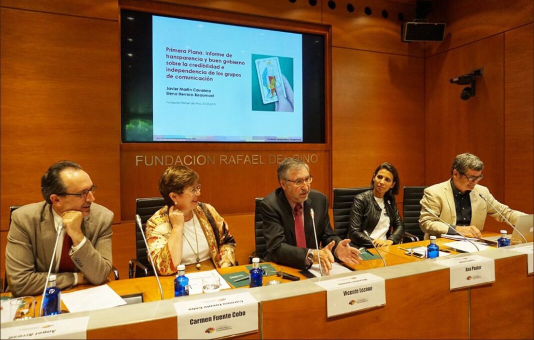 Los grupos de comunicación españoles siguen sin ser muy conscientes de los riesgos que afectan a su credibilidad e independencia editorial, según el informe Primera plana, elaborado por la Fundación Compromiso y Transparencia, y que se ha presentado en la Fundación Rafael del Pino, en compañía de los periodistas Ana Pastor y Giles Tremlett y los profesores de universidad Ángel Arrese y Carmen Fuente.