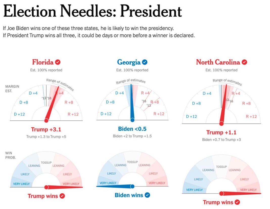 FiveThirtyEight rediseñó sustancialmente la presentación de sus predicciones en 2020, centrándose en la pregunta «¿Cómo presentar un pronóstico que comunica lo que sabemos, pero también lo que no sabemos y lo que podría cambiar?».