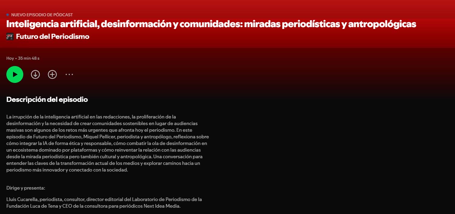 En este episodio de «Futuro del Periodismo», el pódcast del Laboratorio de Periodismo de la Fundación Luca de Tena, Lluís Cucarella conversa con Miquel Pellicer, periodista y antropólogo, consultor y formador especializado en comunicación corporativa, innovación, transformación digital, estrategias digitales y redes sociales.