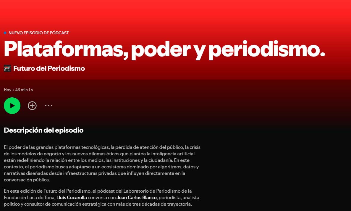 En esta edición de Futuro del Periodismo, el pódcast del Laboratorio de Periodismo de la Fundación Luca de Tena, Lluís Cucarella conversa con Juan Carlos Blanco, periodista, analista político y consultor de comunicación estratégica con más de tres décadas de trayectoria.