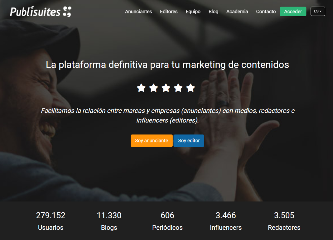 Publisuites es un marketplace que intermedia en la contratación y venta de contenidos patrocinados para branded content, SEO y reputación online, además de redacción de artículos en la sección ‘Redactores’ de su web.