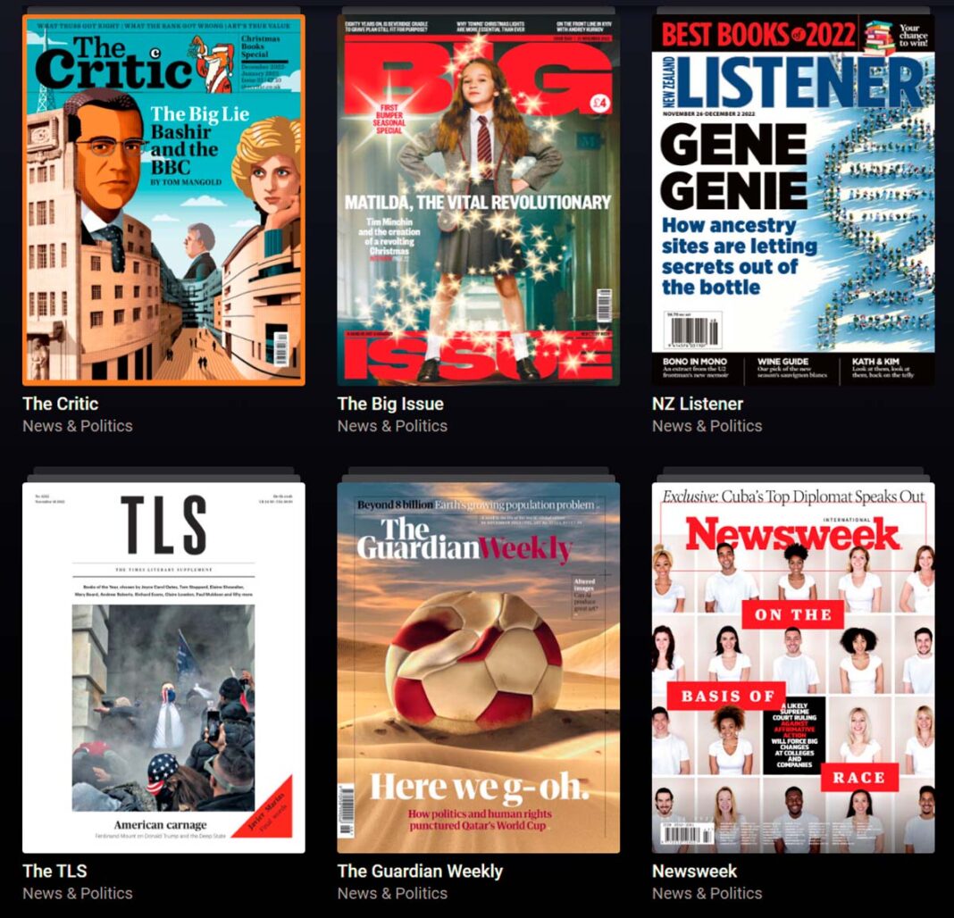 Entre los títulos que ofrece Readly se encuentran revistas internacionales como Squire, Entrepreneur, Bloomberg Markets y Bloomberg Businessweek, Adweek, Moneyweek, Forbes, Fortune, Inc, Wired, Ceo, Hello, Psychology Now, T3, etc., y periódicos como The Independent, The Guardian, City AM, Mirror, Daily Star, The Observer, Aftonbladet, Die Welt, Bild, etc. En el apartado de periódicos su oferta es mucho menor que la de PressReader.