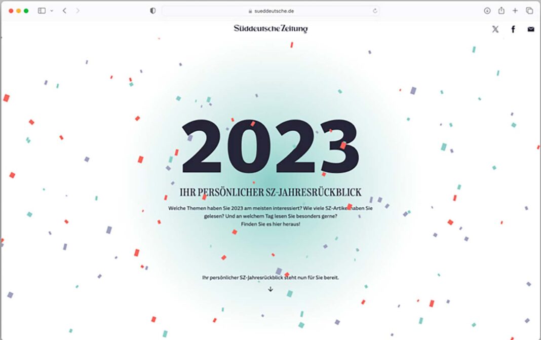 Un año después, en diciembre de 2023, el SZ lanzó el «SZ Jahresrückblick» para sus suscriptores. Esta función transforma el historial de lectura de cada usuario en una narrativa personalizada, destacando los artículos y secciones que más les han interesado. El proyecto fue fruto de la colaboración entre el Laboratorio de Innovación del SZ y el equipo de análisis, con el objetivo de celebrar un año compartido entre el periódico y sus lectores, más allá de una simple relación comercial.