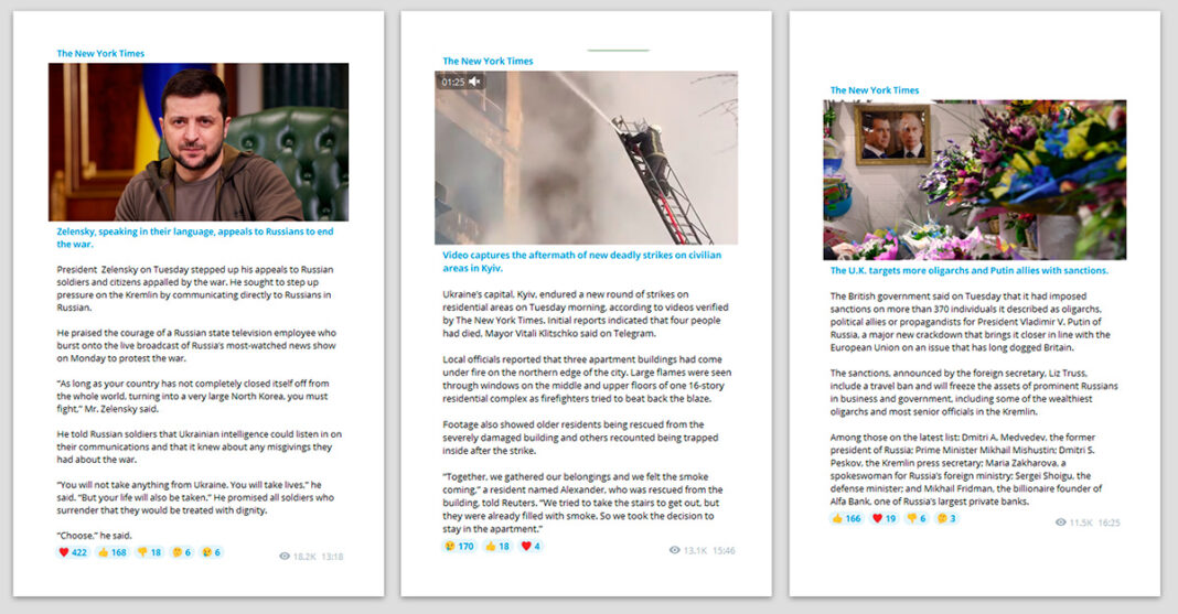Según el New York Times, «el acceso a noticias imparciales e independientes sobre la guerra entre Rusia y Ucrania es esencial. Por eso, hoy lanzamos un canal de Telegram para conocer a los lectores donde están y garantizar que puedan continuar accediendo a una cuenta precisa de los eventos mundiales».