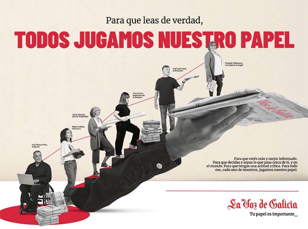 La Voz de Galicia ha puesto en marcha una campaña de marca bajo el lema “Tu papel es importante”, con la que resalta la importancia de la lectura y la información de calidad. La campaña destaca la importancia de cada eslabón en la cadena de valor del periódico, desde periodistas y repartidores hasta personal de rotativa, community managers y quiosqueros, resaltando su papel esencial en la entrega diaria de información al lector.