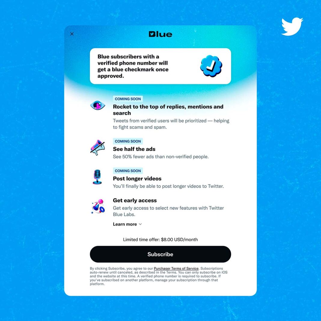 we’re relaunching @TwitterBlue on Monday – subscribe on web for $8/month or on iOS for $11/month to get access to subscriber-only features, including the blue checkmark 🧵 pic.twitter.com/DvvsLoSO50