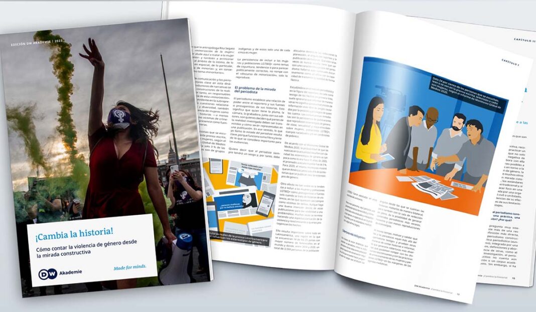 La publicación –de 42 páginas y disponible para descargar en este link– fue hecha por la DW Akademie, el centro de Deutsche Welle para el desarrollo internacional de medios de comunicación, la formación periodística y la transferencia de conocimiento. Surgió de su programa de formación #CambiaLaHistoria, en la que periodistas participan en un proceso dual (de formación y de producción de un trabajo periodístico) con el fin de sumar conocimientos sobre las violencias estructurales contra las mujeres y la comunidad LGBTQI+ y especializarse en el periodismo constructivo.